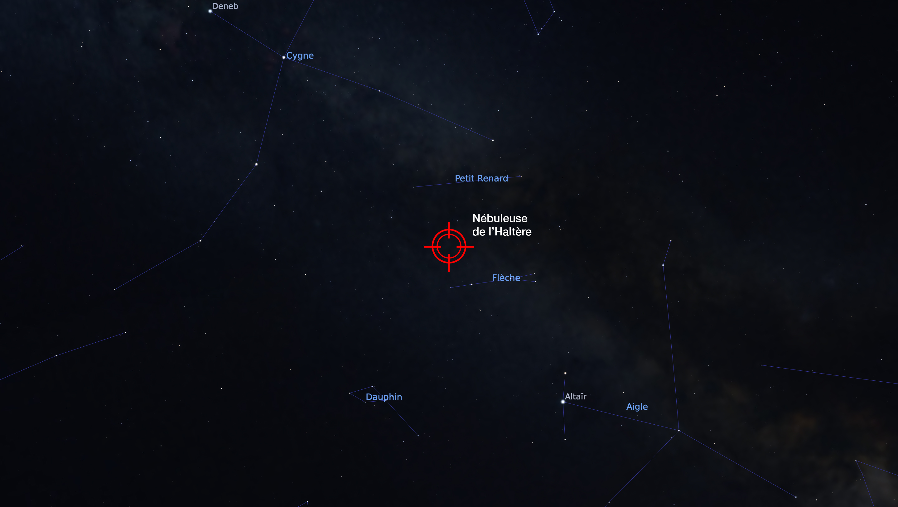 La nébuleuse de l’Haltère (ou Dumbell) est relativement âgée à l’échelle des nébuleuses planétaires, mais aussi assez proche : ces deux paramètres expliquent qu’elle soit l’une des plus étendues du ciel.