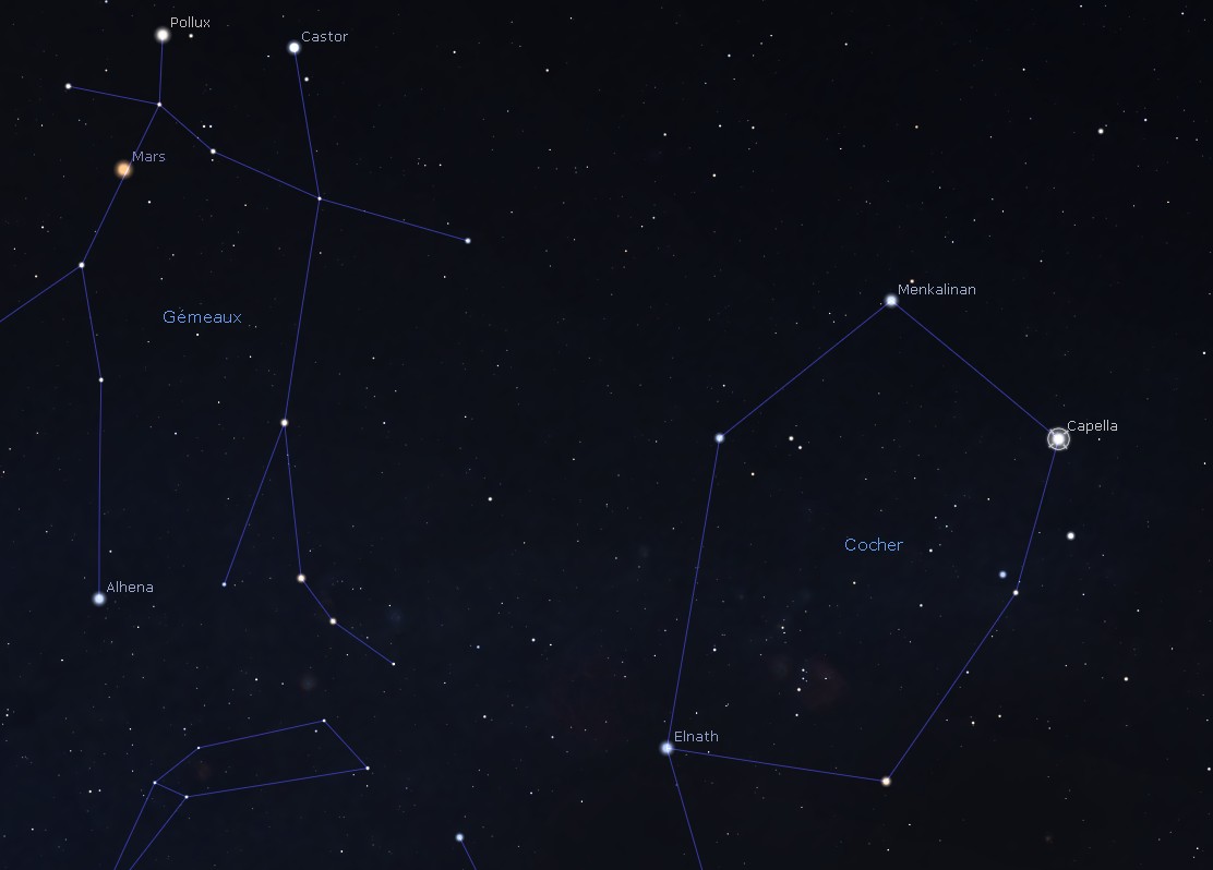 Capella est aussi un moyen très simple de trouver la constellation d’Orion dans le ciel. Elle se trouve à mi-distance d’une ligne sur la voûte céleste entre l’Étoile polaire et Orion.